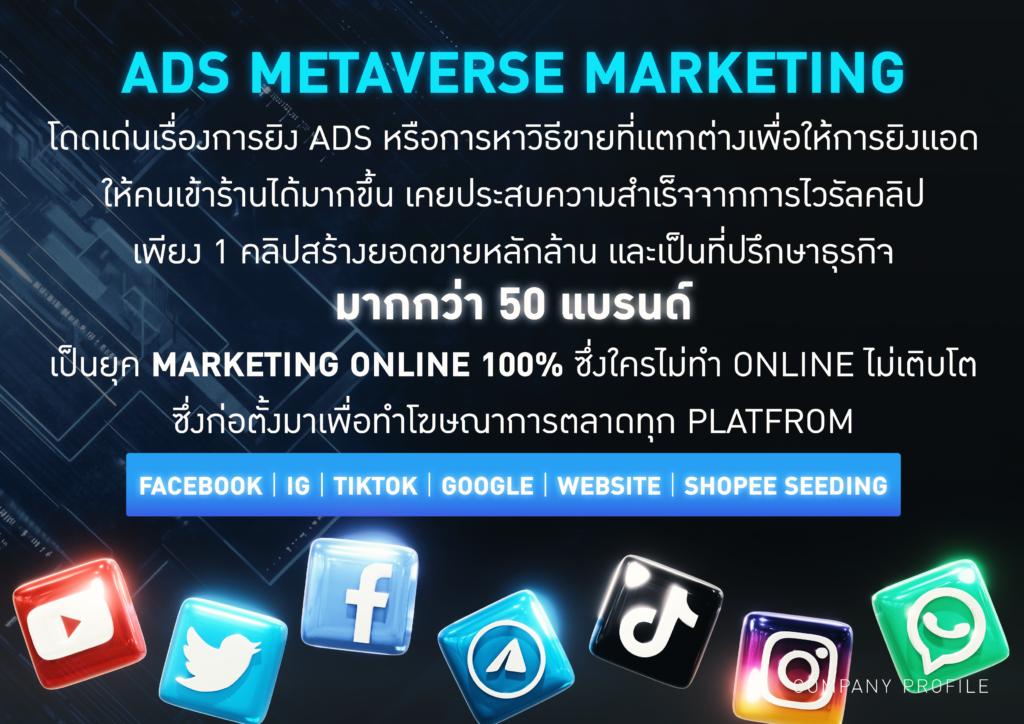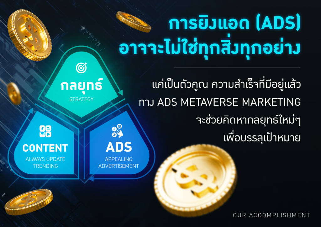 ในโลกดิจิทัลที่เปลี่ยนแปลงอย่างรวดเร็ว ADS Metaverse Marketing ก่อตั้งขึ้นเพื่อเป็นคู่คิดและคู่ขับเคลื่อนธุรกิจของคุณ ด้วยทีมงานผู้เชี่ยวชาญที่ผสานความรู้เชิงลึกด้านการตลาดกับเทคโนโลยีล้ำสมัย เราออกแบบกลยุทธ์ที่ตอบโจทย์เฉพาะสำหรับธุรกิจของคุณ เพื่อสร้างผลลัพธ์ที่เป็นรูปธรรมและยั่งยืน